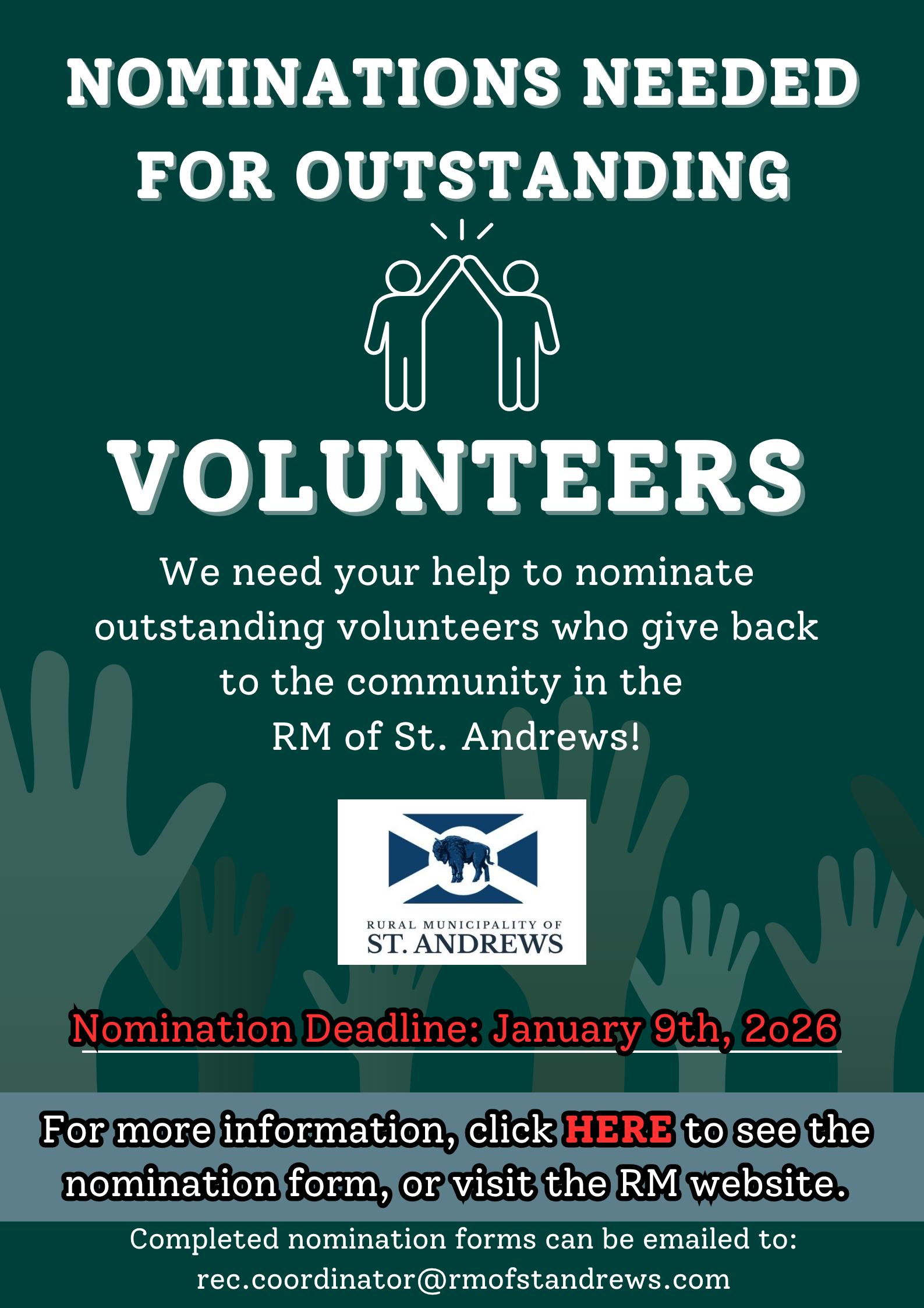 In December 2021, the RM requested community members to nominate outstanding volunteers working for not-for-profit boards or committees during 2020 and 2021. Volunteer nomination forms were circulated, and 50 volunteers were acknowledged by Council for their contributions in the community. Congratulations and thanks for all the work you do to make St. Andrews a better place to live! The list of volunteers can be found here.